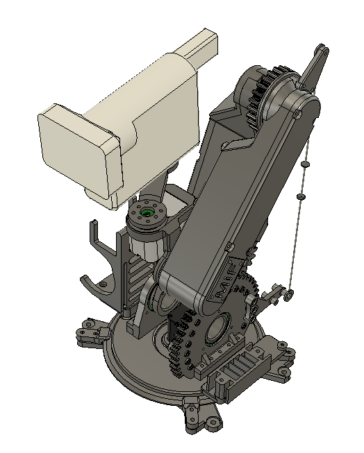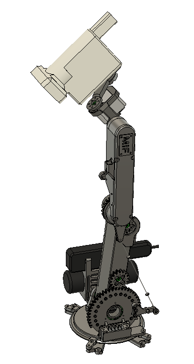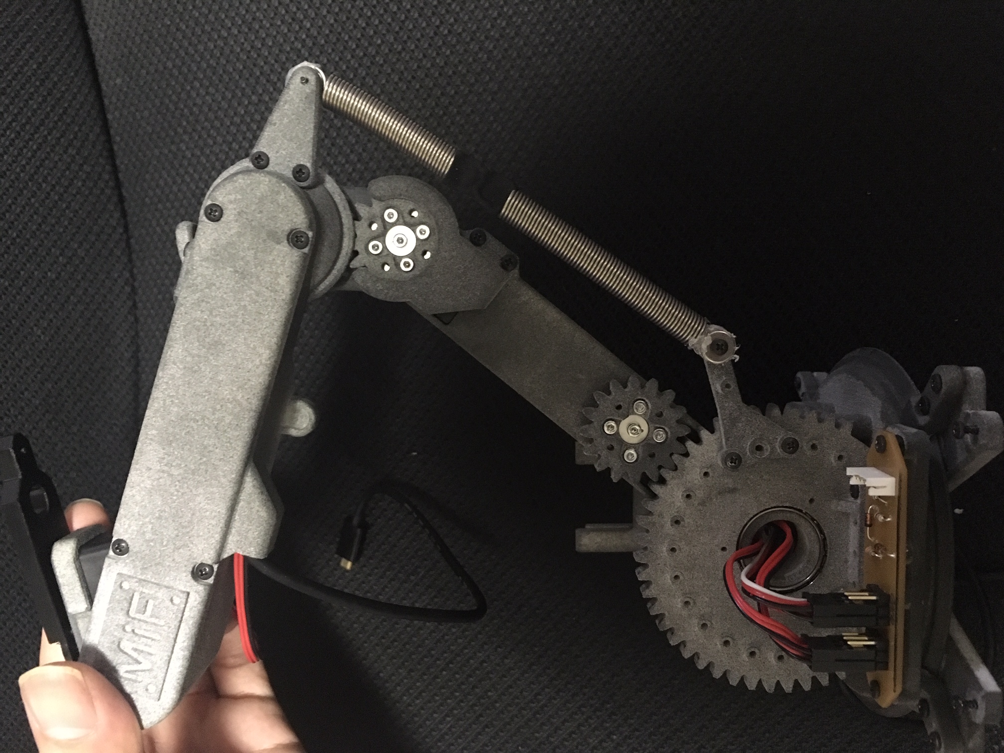 からっ風 Schwarze Katze テクノクエスト仕様 かわロボ 2019年04月21日 からっ風 Schwarze Katze テクノクエスト仕様まとめ 成績:優勝 公式結果URL: https://www.kawasaki-sanshinkaikan.jp/robo/wp-content/uploads/2019/03/Techno_k.pdf 試合中の車載動画: ロボット概要:バトル用のからっ風 Schwarze Katzeに5軸カメラアームを取り付けた構造。 概略設計書: コンセプト: 1.距離感を得やすい映像・情報を操縦者に提供する 2.メカもプログラムもできるだけ簡単に作れて、そこそこのスペックで動くシステムを作る 3.マッピングに挑戦する主な使用部品:・カメラ: HDR-AS300 (sony)・サーボ: RS306MD(双葉電子) ×6個・ワイヤレスHDMI: LDE-WHDI202TR(Logitec)・ワイヤレスHDMIバッテリ:PowerCore 5000(Anker)・HDMIケーブル: DH-HD14SSU10BK(エレコム)・放射温度計: HT-290(Somnus258)・LEDレーザー:POOPE-JGWD-CAR-B(POOPEE) ・ディスプレイ:ノートPC&小型ディスプレイ カメラ&伝送系: 昨年よりワイヤレスHDMIとカメラ内蔵wifiを使用。 カメラ本体 →ワイヤレスHDM(5GHz帯)→モバイルディスプレイ(メイン) →内蔵wifi(2.4GHz帯)→USBアンテナ+USB延長ケーブル2m→PCディスプレイ(サブ) という2系統。仕様書には書いていないが、HDR-AS300はHDMI出力と内蔵wifi、SDへの記録が同時に行えるので2系統の通信が可能。 メーカー・機種によってはどちらか一方しか出力できない場合もあるので、選定には注意が必要だと思う。 ワイヤレスHDMIは通信距離7mほど。会場の壁を挟んでもレスポンスは良いので操縦の遅延は気にならないレベルで、タイムの短縮に有効だった。wifiは出力弱いので距離が飛ばず、遅延が大きいものの、USB延長ケーブルを使用して壁の反対側までアンテナを伸ばせば大きな問題なし。ただし、HDMよりは遅延大きめ。 こんな感じで2画面体制放射温度計: 例のごとく温度計のディスプレイをカメラでのぞき込む方式。 放射温度計は測定距離眺め、ディスプレイ大きめだと操縦しやすいと思う。 カメラアーム: 軸数:6 アーム長:約350mm 昨年までのアームはこんな感じでした。 1軸増やして6軸になったため、真後ろを見れるようになった。後部がよく見えるため、フィールド端や壁のギリギリまで接近させることができる。フィールドの縁が怖くてうまく旋回できなかったプレ大会の課題を解決できたように思う。※今回の競技では使う機会が無かった 設計・製作は作りやすく、安全性の向上を目標に。 組み立てやすさは3Dプリンタ前提の設計で部品点数を少なくし、組み立てを楽に。 3Dプリンタは持っていないので、部品造形はDMMの3DプリンタサービスでMJF-PA12GBで依頼。予備部品含めて2万円/1台程度。↓こんな感じで造形を依頼 予想以上に造形精度がよいため、ほとんど追加工なく組み立てることができた。 ただし、表面がざらざらしているのを放置した摺動性は悪く、摺動部の組み立ては苦労した。グリースを付けても油が拡散してしまうため、当日は追いグリースで何とか・・・ 安全性の向上としてはできるだけエッジを減らすことと、配線の露出を少なくすることで、アームや配線が引っ掛かって行動不能になることを回避した。 配線類はできるだけ関節の内側を通している。 上体の揺れによるモーメントでサーボが破損するのも怖いため根元はスラストベアリング+揺れ防止のガイド付き トルクOFFにしたときにサーボの動作範囲を超えないようにストッパーを付けている また、適度に減速・バネ補償を加えることで、長時間アームを伸ばしても熱で落ちない構造になった。 サーボへの負荷が小さくなったので、RS301CR(定価9000円)×6からRS306MD(週間ロボゼロで2000円くらい)×6へ大幅コストダウン! (はるか昔に1ダースまとめ買いしたサーボがやっと役に立った)念のため根元3軸分は金属ギヤに交換した。 今回作ってみて、カメラの軸が中心からずれていると操縦しづらいことがわかった。ずれていると、映像の進行方向が曲がっているように見えるため、カメラが曲がっているのか、進行方向がずれているのかわかりにくい。3D地図:3D地図は後処理で行っている。カメラで撮影した映像を一定時間ごとに画像化し、ReCap Photoにて3次元を構築する。ReCap Photoは画像の特徴点を自動検出して、2D画像から3Dを構築できるソフトで、リアルタイムに地図を作成するソフトではないので注意の必要あり。肝心のデータは・・・ なんとか、それっぽい見た目になった。スタートから白いエリアを超えるまでの29枚を合成。画像の左下の点はカメラ位置。参考までにデータを増やすと異次元空間に・・・・ 画像の合成が上手くいかない理由としては、カメラの視点を動かしているため、特徴点が一致しない空間があるのかなと。カメラは固定で、フィールドをぐるっと回った方がよいデータになりそう。 PR