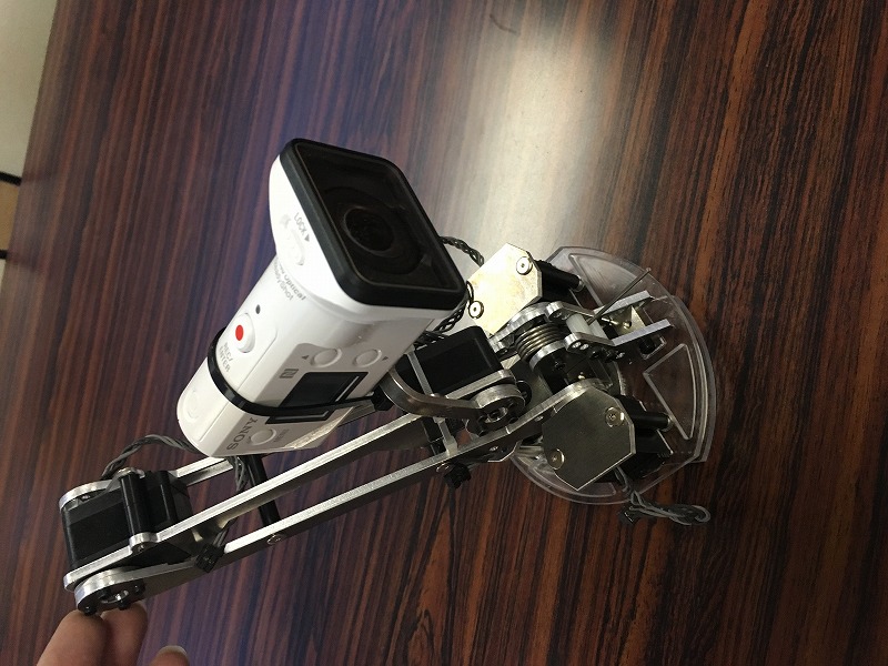 かわロボ技術賞テクノ・クエスト かわロボ 2017年04月09日 かわロボ技術賞 テクノ・クエスト プレ大会のまとめです。 ロボット:からっ風Gimlet FPV モード結果:優勝(結果:http://www.kawasaki-net.ne.jp/robo/wp-content/uploads/2017/03/Techno.pdf)かわロボ系の大会で初優勝です!バトルではなかなか成績残せていませんが、探索では勝てました!やったー!【ロボット概要】ロボット本体・・・からっ風Gimletカメラアーム・・・4軸、長さ300mmカメラ・・・・HDR-AS300(sony)カメラアーム用サーボ・・・RS301CR(futaba)温度センサ・・・AD-5617(A&D)表示装置・・・・NEXUS7【競技内容】マス目が描かれたフィールド上にオブジェが置いてあります。ロボットを遠隔操作し、フィールド上のオブジェの場所を記録すると得点です。フィールドはバトルフィールド3面分で基本的に平地でした。得点方法・オブジェと障害物の場所(マス座標)と種類を記録・水入りペットボトルの場所と温度を記録(当日に冷、温の2値で記録するように変更)・一定区画に入場すると得点・残り時間に応じてボーナス得点試合動画(車載):テストラン動画:試合中のロボットの動きは公式から公開されると思います。以下詳細です。【設計方針】低予算で十分な性能を目指して設計しました。※申請書類は表示用の携帯まで含めたためすごい額に・・・・。ロボット本体とサーボは手持ちのものを使用。ただしバトル仕様は早すぎるので電圧半分(6.6V)で動作。カメラと温度センサは持っていないので性能が十分そうなものを購入。ロボカップレスキューの経験から、複数の視点の映像が有効な事がわかっていましたが、カメラを複数積むのはコスト&通信的な問題があり、カメラ動かした方が安いんじゃね? という結論に。カメラの位置は ①ロボットの斜め後ろからの俯瞰映像が見えること ②温度センサの表示温度が見えること ③ロボット後方が見えることを意識してアームを設計しました。【画像伝送】今回の大会で最大の課題は画像伝送だと思います。これはいくつか方法がありますが①カメラ+Wifiルーター搭載②wifiカメラ③カメラ+無線データ転送あたりが使いやすい組み合わせかと思います。使用する機器によっては①③の方が距離は飛びますが、システムが大きくなりそうなので今回は②としています。wifiカメラは一つ問題があり、基本的に長距離飛ばさないので、飛距離は買ってみないとわからないという問題があります。数年前にAi-Ballを使用したときは、プロポの電源を入れた段階で通信できなくなりました、(個体差があるようです)どうせ買うなら失敗したくないので、ちょっと奮発してSONYのHDR-AS300を買いました。通信距離+手ぶれ補正が効果が強く、これが正解でした。プロポが2.4GHzのため、可能であれば5GHzあたりの電波を使いたいところですが、5Gあたりで安いモジュールを知らないので2.4GHzを選定しました。免許があれば5GHz帯のFPVドローン系の物が安いと思います。2.4GHzを使用する場合はプロポのアンテナと映像受信部をできるだけ離すか、アンテナの弱方向を向ける、遮蔽物を置くなどの対策で多少マシになります。【アーム】カメラアームはロボカップを意識して設計しました。・俯瞰視点で機体の撮影ができること・温度センサをのぞき込める・機体の横と後ろの撮影が可能・ロボコン30thイベントに流用を意識して設計しました。RS301のトルク考えずに設計したらアームが上がらなかったため、最終的には長さを半分程度にしてアーム長300mm程度としました。先端を第一関節として、中間を第2関節、根元の第3関節は2個イチ+バネでトルク確保、さらに根本のヨー角の関節で方向を変えています。 【温度センサ】amazonでメーカー品の安いやつを探しました。非接触だと測定距離1m前後のものと10mm程度のものがありますが、安い10mmを選びました。ボタン押してる間だけ測定できるので結束バンドでスイッチON。液晶に表示されるので、それをカメラに映して確認しました。【本体】本体はからっ風Gimletそのままで、電圧はバトルの半分にして6.6V。アームは200mmを超えられるレベルに残して、先端に温度センサを括り付けただけのシンプル仕様です。【操縦】受信機のPWM出力が8chのためカメラアーム(4軸)のチャンネルが足りない。というわけで、スイッチでバトル用アームとカメラアームの操作を切り替えていました。カメラアームの操作は各関節の角度をプロポで指示し、先端の関節だけは他の関節が動いてもカメラが一定角度になるよう計算しています。【感想】面白い大会でした!ほぼ平面でオブジェを探すだけなのですが、時間制限あり、落下ペナルティありなので急ぎつつ正確に探すという課題になります。今のところサスは不要ですが、低トルクで旋回できるオムニ脚は有効でした。今のカメラ配置だと、前足をオムニ脚にするとよいと思います。床にマス目があるので、フィールド上の距離感やロボットの自己位置はわかりやすくなっています。フィールドも小さいので、今のとこ