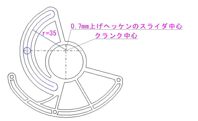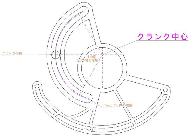 うしとら脚の続き かわロボ 2012年01月11日 これが前の説明でスライダヘッケン(サーキュラーヘッケン)と言っていた足クランク中心≠スライダ円弧の中心点(クランク中心の0.7mm上)となってますでもってこれがからっ風QEに使ってるうしとら脚前回触れてない部分ですね。120度の範囲で円軌跡、そこから切り返し点に向かって自分でてきとーな曲線を書いてます。120度の範囲ではクランク中心=スライダ円弧の中心点です。誰か角加速度一定な軌跡の書き方考えてくれたりしないかなー。とか。そういえば、本家のと違ってこれはスライダの摩擦が大きく影響します。特に、片方の切り返し地点で大きくなるので、クランクの摩擦とスライダの摩擦がつりあってロック。なんてことになりやすいので注意が必要です。自分はベアカム&スライダにベアリングというベアリング4つ/足な構成にしています。QEに使ってるベアリングが60超えるwベアリングなくても動けば・・・いいなあひまになったら後ほど詳しく書きます。自分でもまとめておきたいしね。