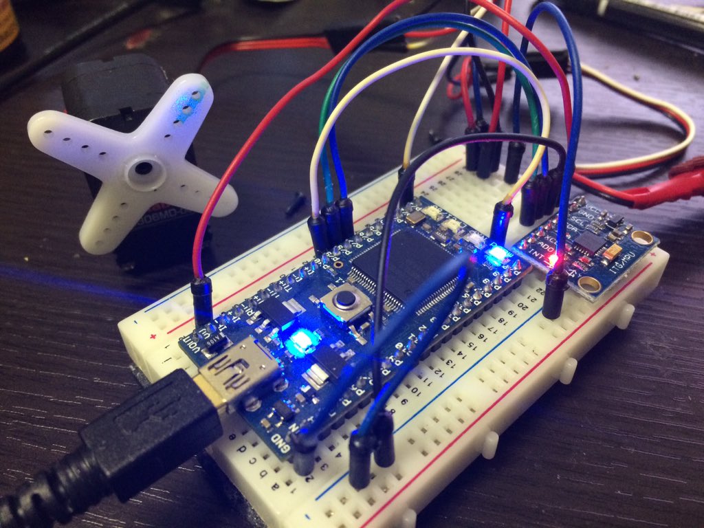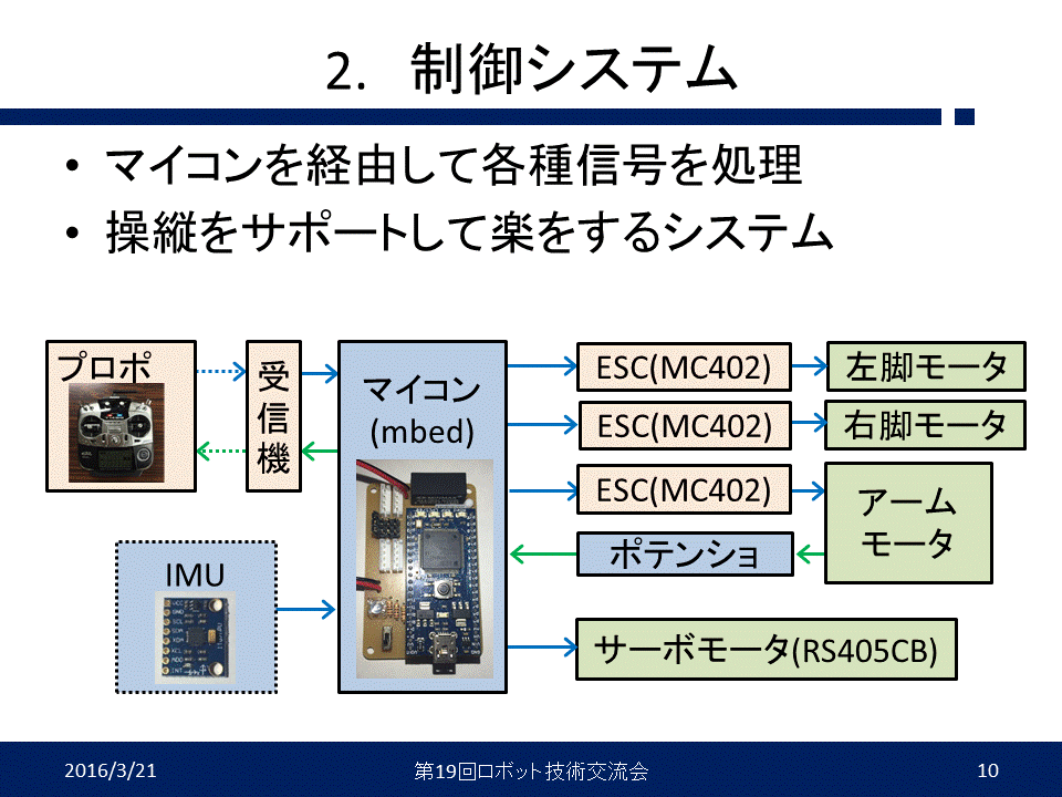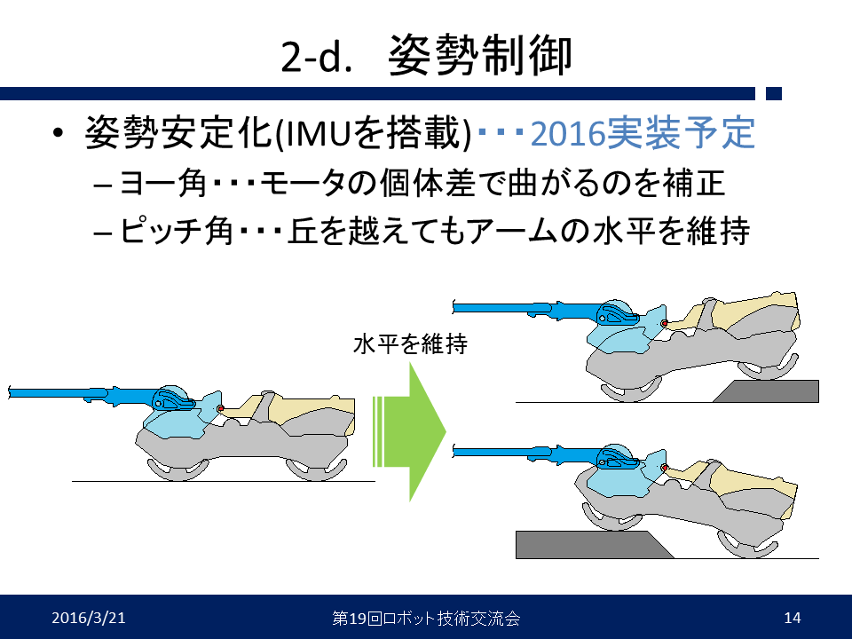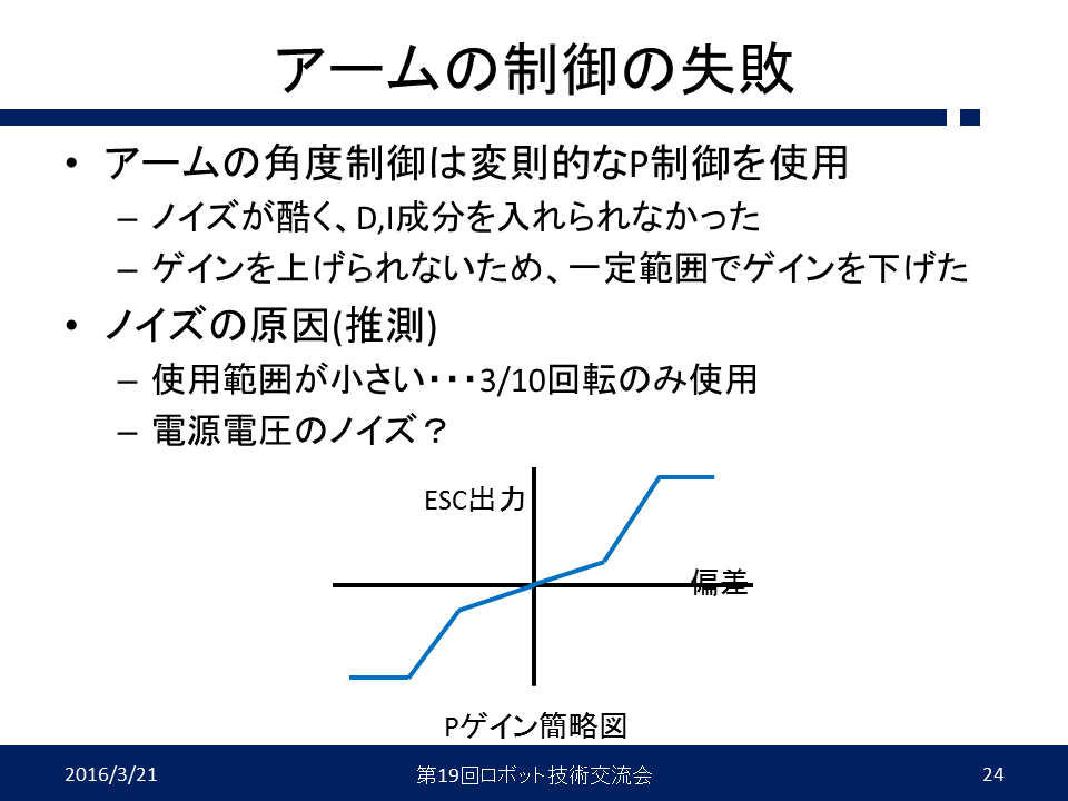 IMU買ってみました かわロボ 2016年01月09日 あけましておめでとうございます。からっ風シリーズの直進できない問題対策でジャイロ使いたいなーと思いつつなかなか時間が取れなかったので、冬休みの課題?としてGY-521(MPU6050)を買ってみました。GY-521内部は6dofのIMUで、通常加速度3軸、角速度三軸ですが、DMPを使用すると内部で角度に変換して出力できるそうです。自分で積分するより優秀そう。ってわけで試してみました。一個340円でした。驚きの安さ。 ヨー角を取得してサーボに送っています。IMUとサーボを一緒に動かすと指南車的な動きになります。mbedのライブラリ関係は下記のものを参考にしました。・ライブラリ:https://developer.mbed.org/users/syundo0730/code/MPU6050-DMP/・メインプログラム:https://developer.mbed.org/users/syundo0730/code/MPU6050-DMP_sample/・メインプログラム:https://developer.mbed.org/users/PandaHouse/code/MPU6050Test/ヨー角の角速度積分はドリフト誤差が蓄積していくので、どのくらい誤差が溜まるのか見てみました。 横軸が時間[min]縦軸が角度[deg]スタート直後30秒ほどで20度までドリフトし、その後は1時間で20度程度でした。3分で1度。思ったより高精度でした。すげーなーただ、途中で明らかにおかしい信号が入ってくるときがあり、繋いでるサーボがカチャカチャ動くことがありました。瞬間的に180度とかになったり。配線が悪いのか、プログラムが悪いのか、基板に問題があるのか・・・。その辺もうちょい確認しないと。なにはともあれ角度読めました。あとは使い方かな
