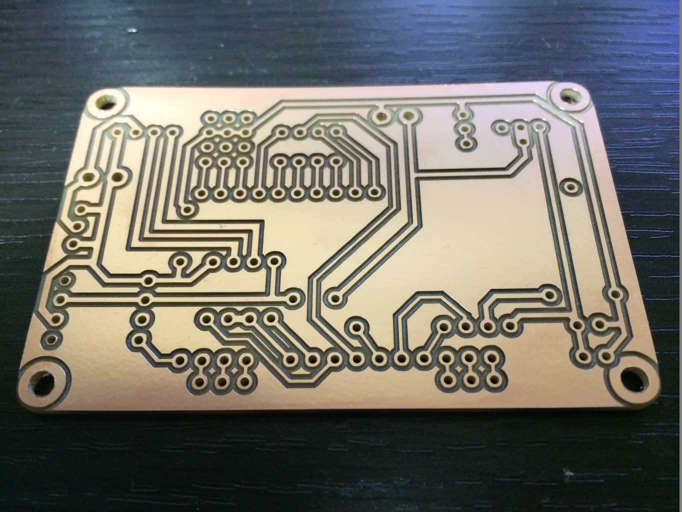 基板切削してみました ロボット全般 2016年02月11日 基板切削してみました。 これは思っていたよりも便利。今までユニバーサル基板で作ってきたので、自由度上がるし楽になって良いですね。穴あけと外径切削はΦ1エンドミル パターンの切削は90度のエンドミルで切込み0.2mm(切削幅0.4mm)うちのRD300のシャンク径が4mm固定なので、シャンク径4mmで揃えました。削っといて部品が無かったので、完成はまだ先ですが・・・