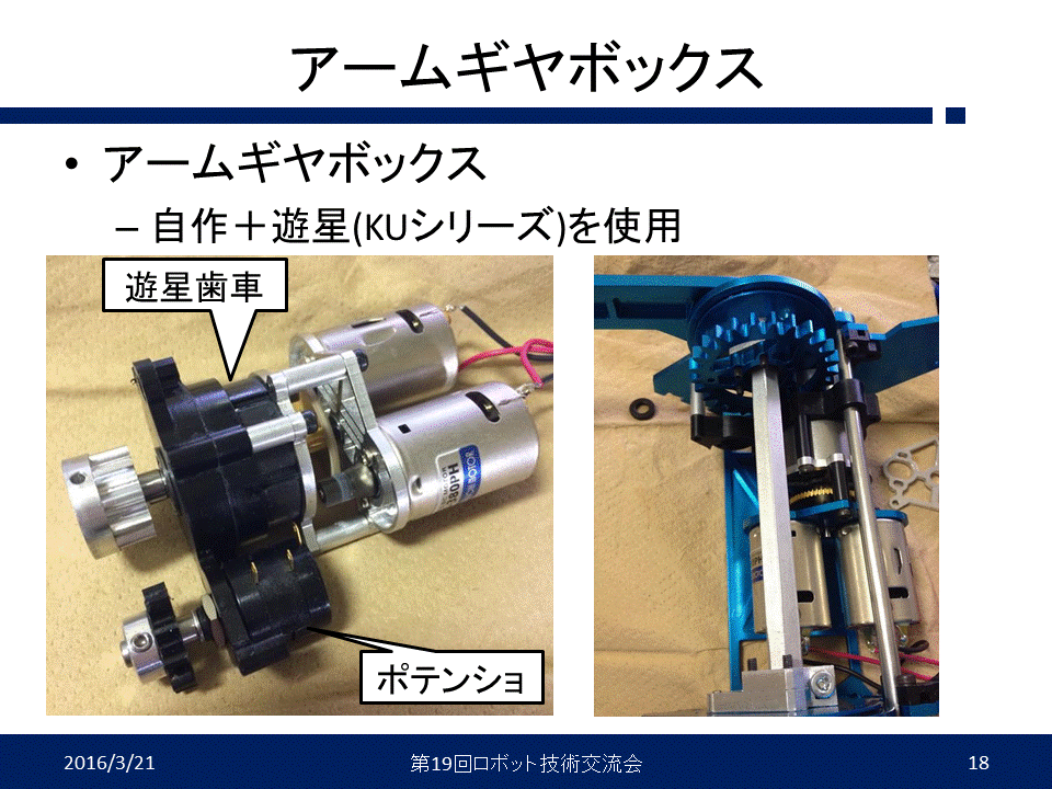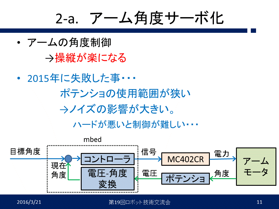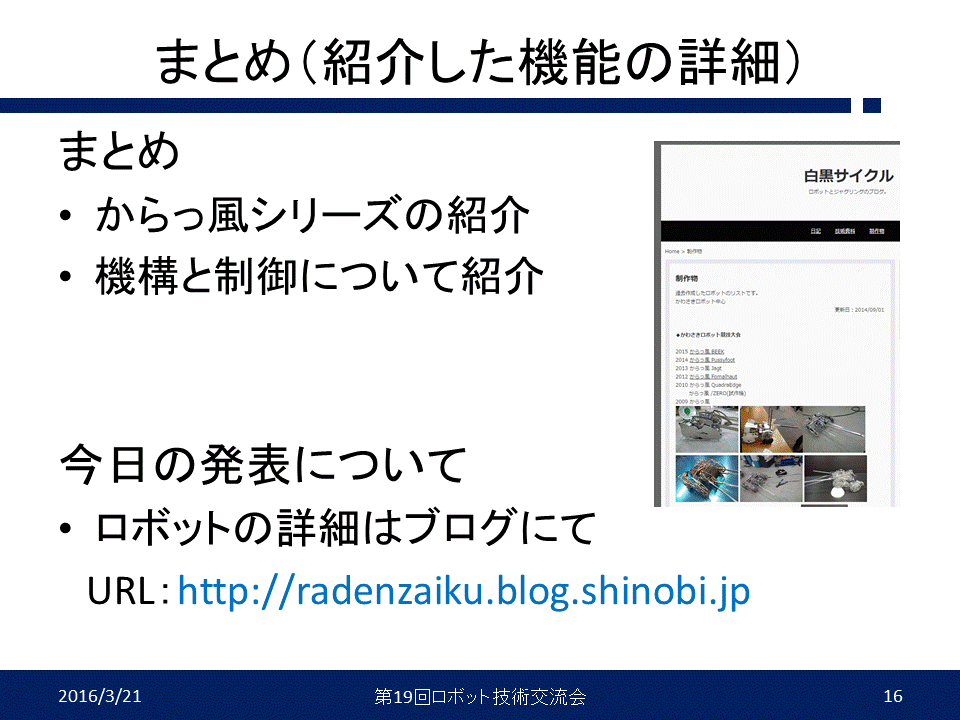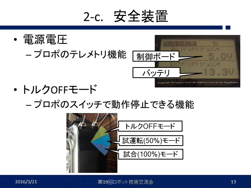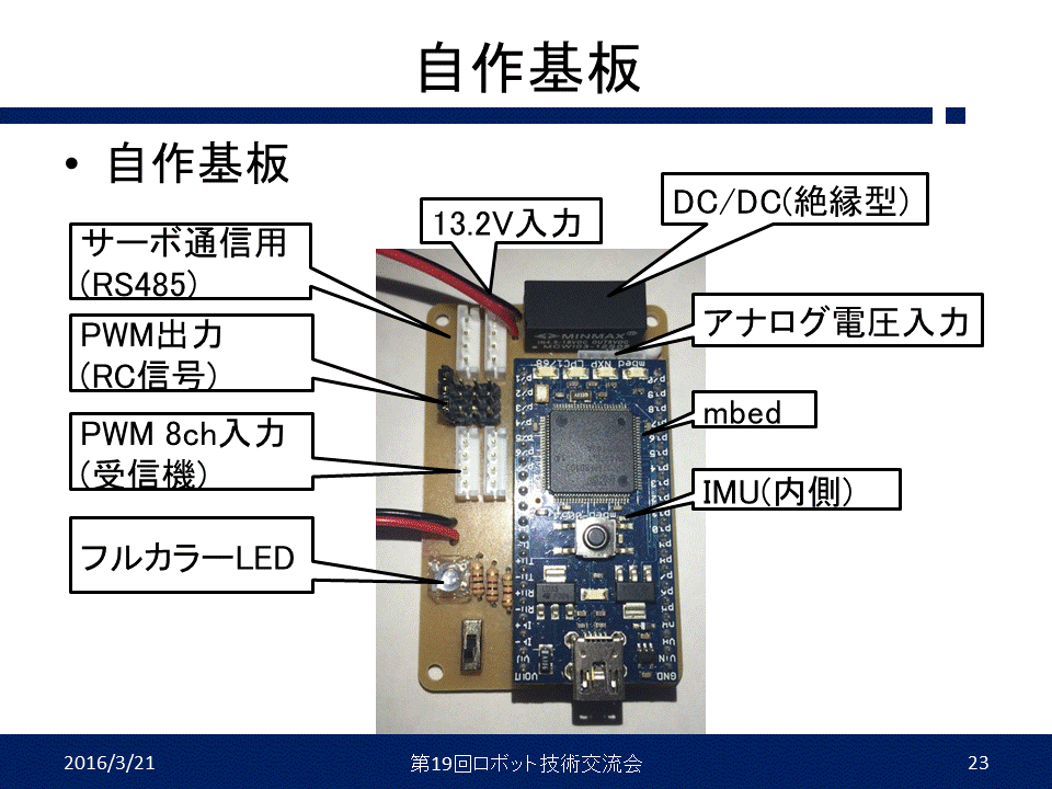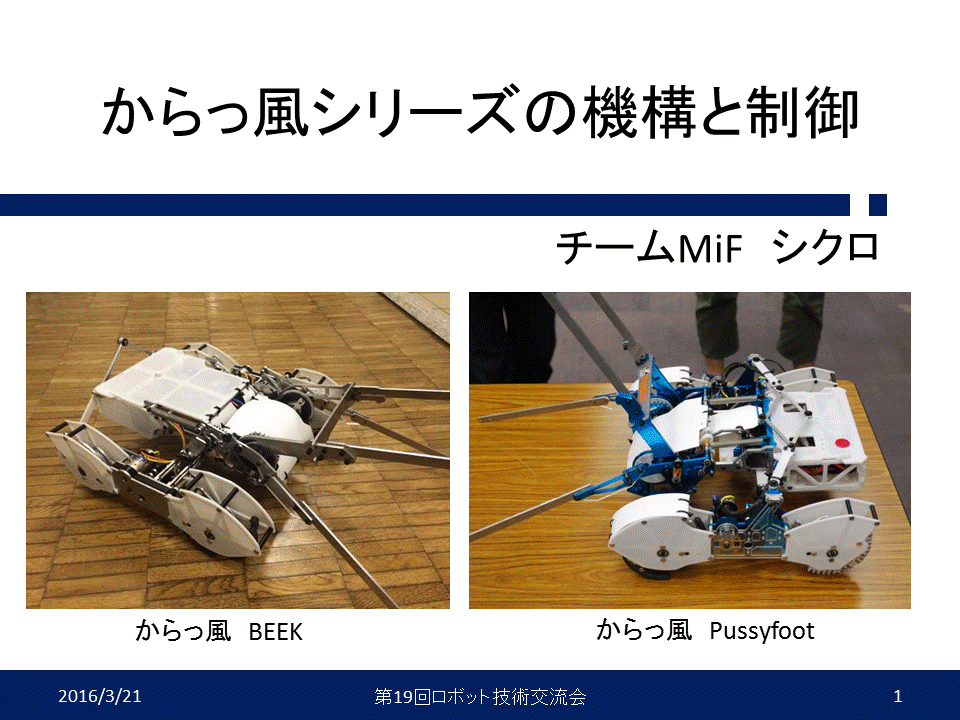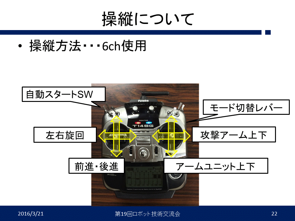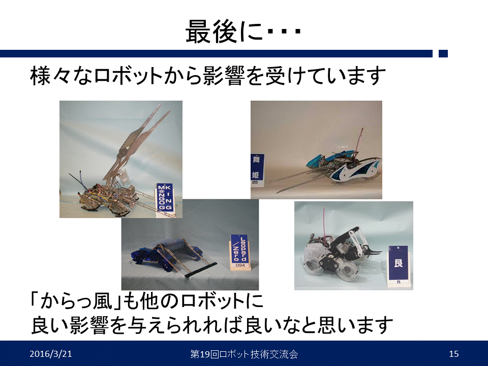 高専ロボコン東北地区交流会 高専ロボコン 2015年12月23日 高専ロボコンの東北地区交流会に参加してきました。高専ロボコンに参加した高専生が集まって技術交換する会です。現役に刺激を提供する役としてOBも呼ばれています。代表と研究室が同じだった縁があって、何年か前から参加しています。会はほとんどプレゼンし合う形です。北海道から九州までの高専が集まり、自分のチームの紹介します。 ロボットのデモンストレーションもありました。 奈良高専「大和」のサンバーストを間近で見せてもらいました。通常段とサンバースト(巨大輪)を同時に着弾するように撃つことで防御させない必殺技です。正面から一点突破するアイディア好きです。私はOBとしてかわさきロボットとFRCの紹介・からっ風の操縦体験などを行いました。現役の皆さんの刺激になればよいなーと。ちなみに無線環境が気になっていたので、そのへん集中的に聞いていました。まとめると、・ほとんどの高専がXBeeかBluetooth(2.4GHz)・RC用プロポ(2.4GHz)は1校・XBeeには種類があり、良い奴を使っている高専は通信が安定していた・920MHzは3校。うち2校は双葉電子のFEP01、1校は聞きそびれました・・・・ROHMからLazuriteという920MHzモジュール搭載のマイコンが発売した・5GHz帯の使用は1校。カメラ用私は電波に詳しくはないですが、国技館で良さそうな通信システムとしては・XBee+920MHzの並列・2.4GHzラジコンプロポあたりが良いのかなーと思いました。ではでは