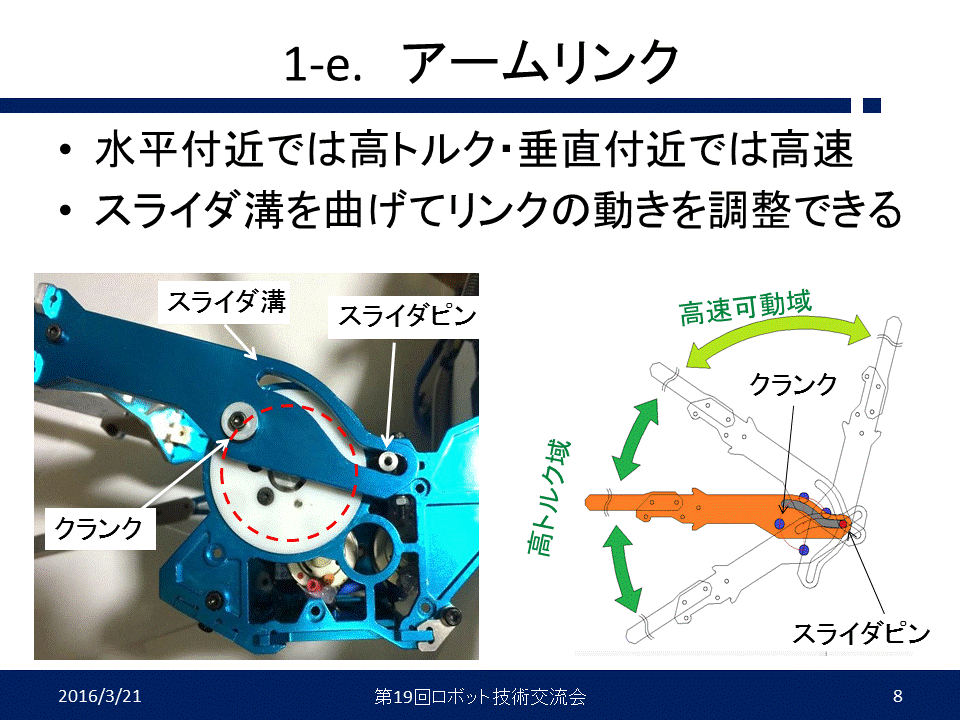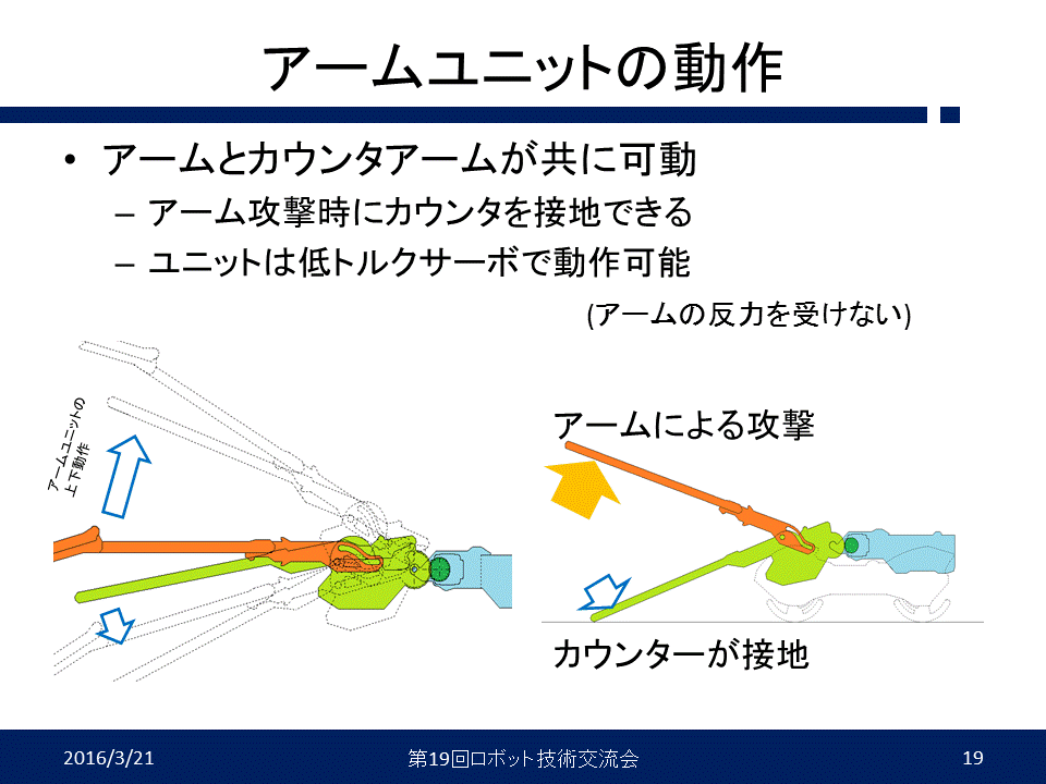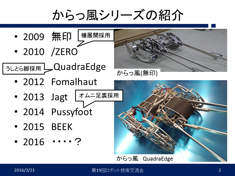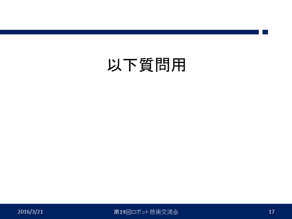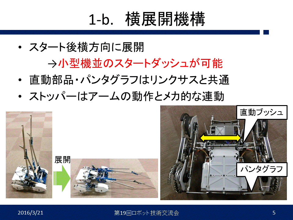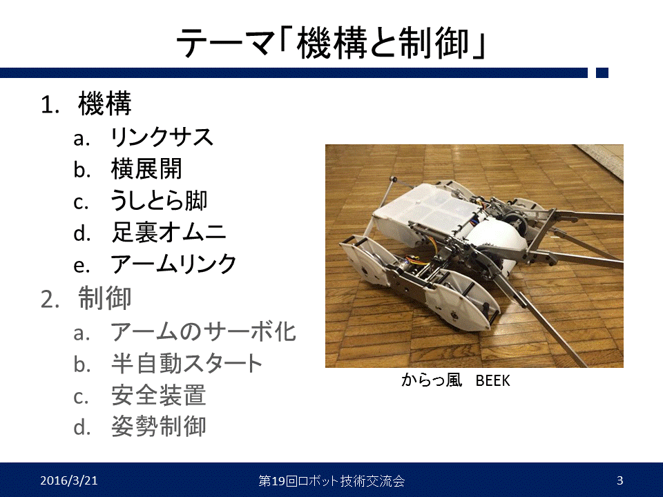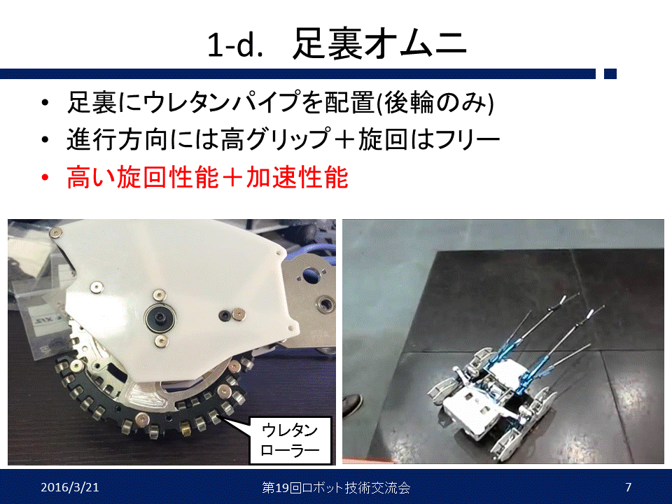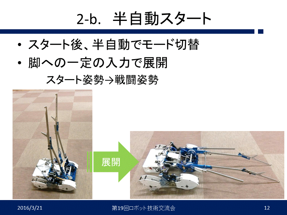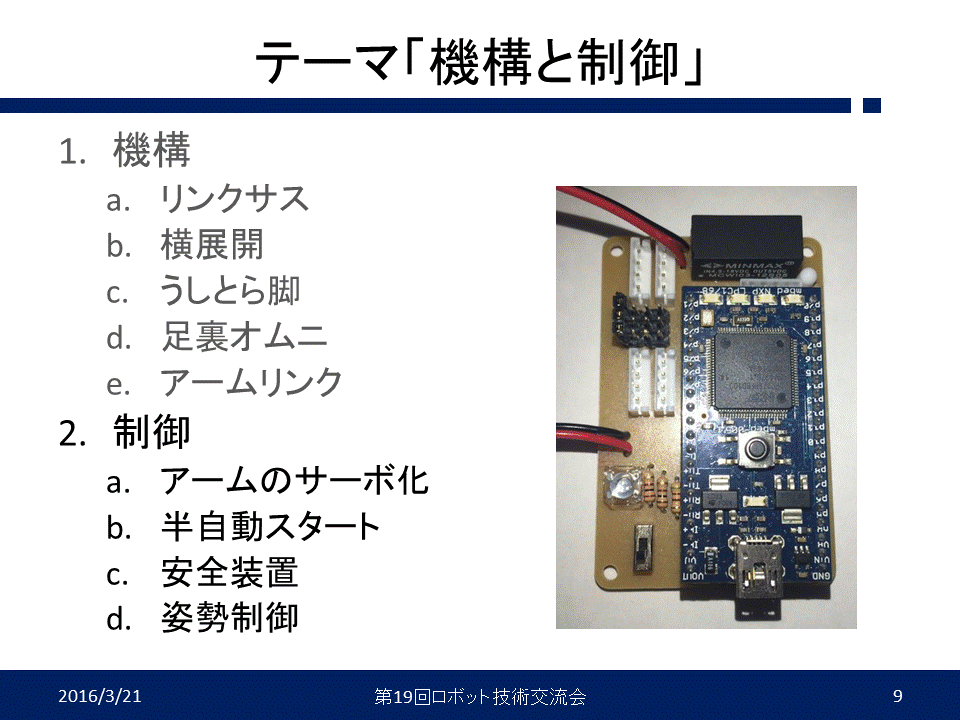 高専ロボコン東北地区交流会 高専ロボコン 2015年12月23日 高専ロボコンの東北地区交流会に参加してきました。高専ロボコンに参加した高専生が集まって技術交換する会です。現役に刺激を提供する役としてOBも呼ばれています。代表と研究室が同じだった縁があって、何年か前から参加しています。会はほとんどプレゼンし合う形です。北海道から九州までの高専が集まり、自分のチームの紹介します。 ロボットのデモンストレーションもありました。 奈良高専「大和」のサンバーストを間近で見せてもらいました。通常段とサンバースト(巨大輪)を同時に着弾するように撃つことで防御させない必殺技です。正面から一点突破するアイディア好きです。私はOBとしてかわさきロボットとFRCの紹介・からっ風の操縦体験などを行いました。現役の皆さんの刺激になればよいなーと。ちなみに無線環境が気になっていたので、そのへん集中的に聞いていました。まとめると、・ほとんどの高専がXBeeかBluetooth(2.4GHz)・RC用プロポ(2.4GHz)は1校・XBeeには種類があり、良い奴を使っている高専は通信が安定していた・920MHzは3校。うち2校は双葉電子のFEP01、1校は聞きそびれました・・・・ROHMからLazuriteという920MHzモジュール搭載のマイコンが発売した・5GHz帯の使用は1校。カメラ用私は電波に詳しくはないですが、国技館で良さそうな通信システムとしては・XBee+920MHzの並列・2.4GHzラジコンプロポあたりが良いのかなーと思いました。ではでは