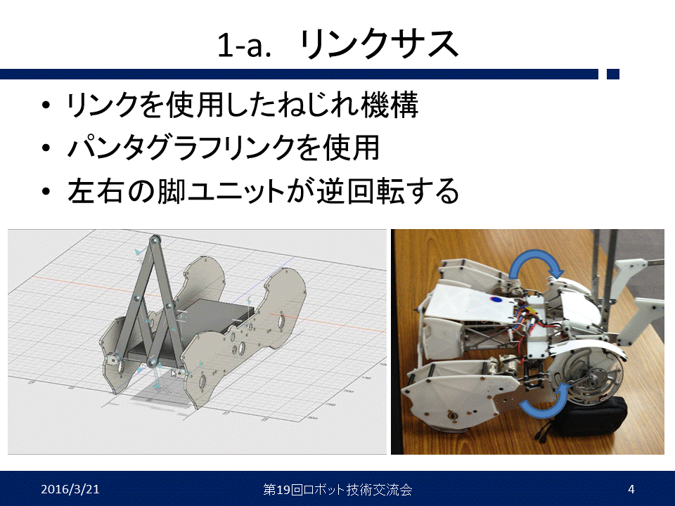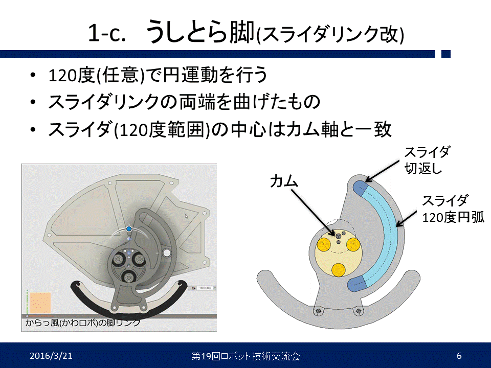 Fusion360 かわロボ 2016年02月28日 Fusion360は趣味利用無料と聞いて試してみました。こいつ・・・動くぞ・・・スライダの部分は接触判定で拘束しています。脚の動きがCAD上で確認できるといいですね。今まで↓な感じで確認してたので、PC上で動くと確認楽そう。 そのうちアームのリンクも試してみます。ちょっと使ってみた感じは・アセンブリの合致条件が独特?・接触判定を使用してスライダリンク等が可能(たまに判定ミスる)・JWCADで出力したDXFを読むとサイズが10倍になる。縮尺で対応可能・線が繋がっていないデータを自動で繋げる方法はなさそう?手動で合致できる。 (SWではある程度条件設定ができた)・Fusion360で出力したDXFをJWCADで読むと一部化ける・Fusion360で出力したDXFをHo_CAD2.7で読むと凄い形状になるDXFに関してはうちの環境が古すぎるだけなんですが、3D→2Dに変換するのは難しそう。とりあえず色々やってみたいと思います。