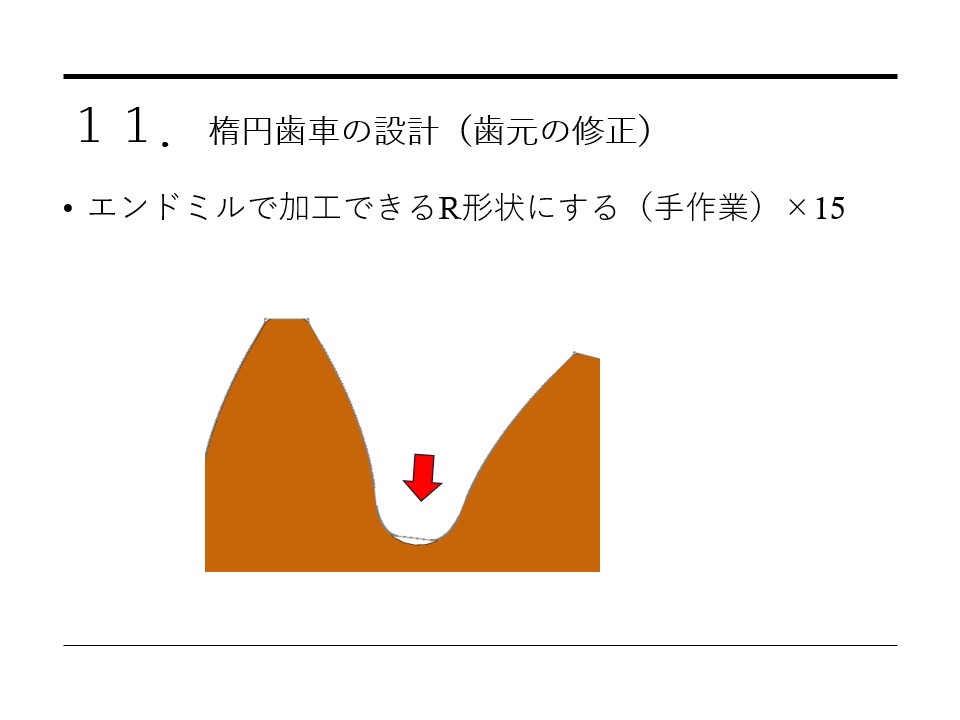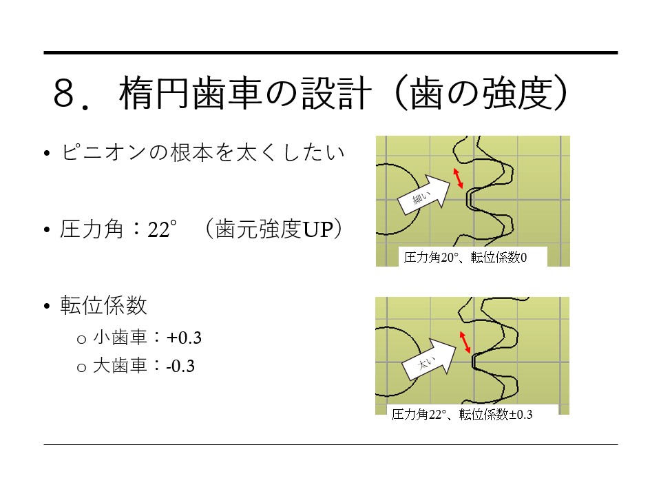 楕円歯車の課題として、一番力が出る角度の小歯(軸中心に最も近い歯)が弱くなるため、