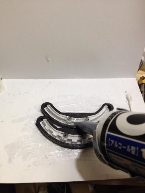 一時期シリコンシーラントが流行っていましたが、シリコンシーラントで足裏を作ると走行練習した家の床が滑りやすくなる(気がする)ため、より強度・摩擦係数の高いウレタンにしました。